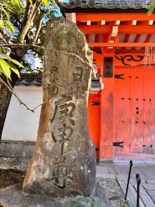 赤い門を正面に見た時に、左手に「日本最初 庚申尊」と彫られた石碑が目印。