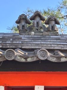 門の上で参拝者をお迎えする三猿。左から、聞かざる、言わざる、見ざる。
