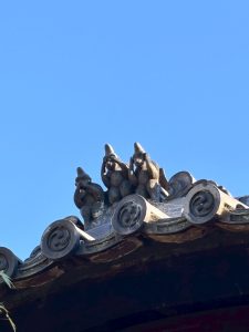 本堂屋根の上にいる三猿。左から言わざる、見ざる、聞かざる。