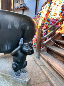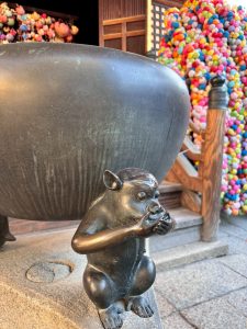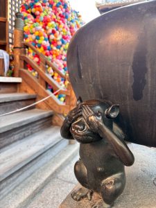 八坂庚申堂では、色鮮やかなくくり猿の存在がとても目立つので、目を凝らして意識しないと、三猿の存在にはなかなか気が付きにくいのですが、上記のように、あちらこちらで三猿たちが活躍しています。