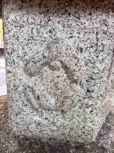 先ほど紹介した門そばの石碑の上部に彫られた三猿。左から、言わざる、見ざる、聞かざる。