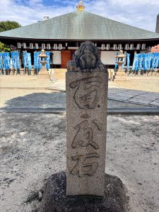 まずはお堂の正面にある「お百度石」にいる三猿。