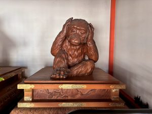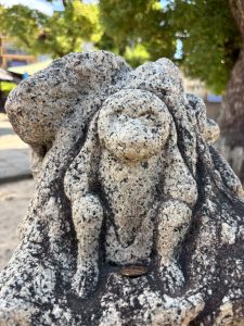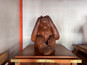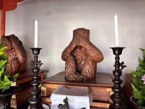 左から、「見ざる・言わざる・聞かざる」の順に並んでいます。中でも印象的なのは、見ざるのおサルさんの姿。天を仰いで目を押さえ、躍動感があります。これまで、たくさんの寺院のおサルさん達に会ってきましたが、こちらこの三猿の大きさは、特別です。足元には、小さな石像の猿も並んでおり、まるで弟子たちを従えているいかのよう。