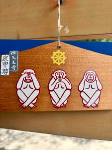 四天王寺庚申堂は、絵馬にも可愛らしい三猿が描かれています。その並びは、三猿堂の三猿と同じ、左から「見ざる、言わざる、聞かざる」。絵馬が重なり合う様子は、まるで三猿が人々の願いを守っているようです。